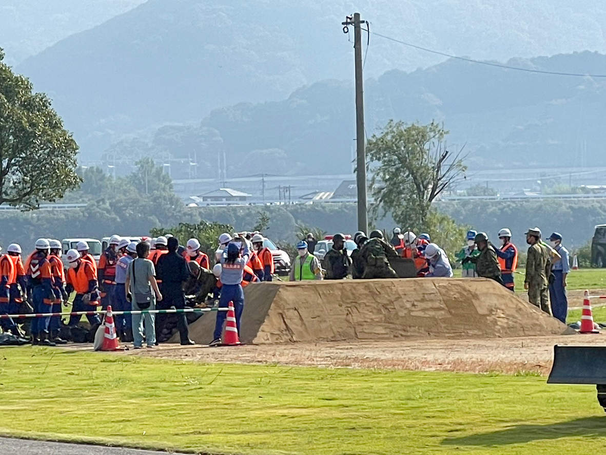 10月2日(日)球磨川河川緑地にて、防災関係機関(国土交通省八代河川国道事務所、熊本県、八代市、八代広域消防本部、陸上自衛隊西部方面特科連隊第1大隊、熊本海上保安部、熊本県警八代警察署など28機関)の連携強化及び住民の防災意識の高揚を図ることを目的として開催されました。水害で取り残された場合の救助作業や地震発生時の土砂埋没救助など実際の救助現場を想定した訓練が本番さながらに行われ、ヘリによる救助や運用、応急救護所や避難所の運営訓練やライフライン復旧訓練など多岐に渡り訓練が行われました。