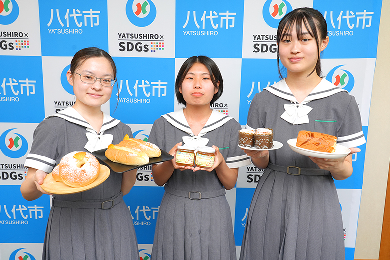5月24日(金)、八代農業高校の生徒らと関係者が、「甘夏マーマレード」を使用した4つのベーカリー商品の完成報告のため八代市役所を訪れ市長表敬を行ないました。今回商品化されたパンに使用されている「甘夏マーマレード」は、八代農業高校の生徒たちが、校内で栽培した甘夏を利用して開発したもので、昨年6月に愛媛県で開催された「ダルメイン世界マーマレード&フェスティバル日本大会」で銀賞を受賞しています。商品化されたのは生ベーグル、コッペパンの2品を有限会社ミカエル堂、クロワッサンを有限会社MILKY、ロールケーキを園田製菓舗が開発。商品は各店舗において4月より販売されています。なお、原材料のマーマレードに限りがあるため、6月中には販売が終了する見込みとなっており、次回の販売は来年の2月以降になる予定となっています。