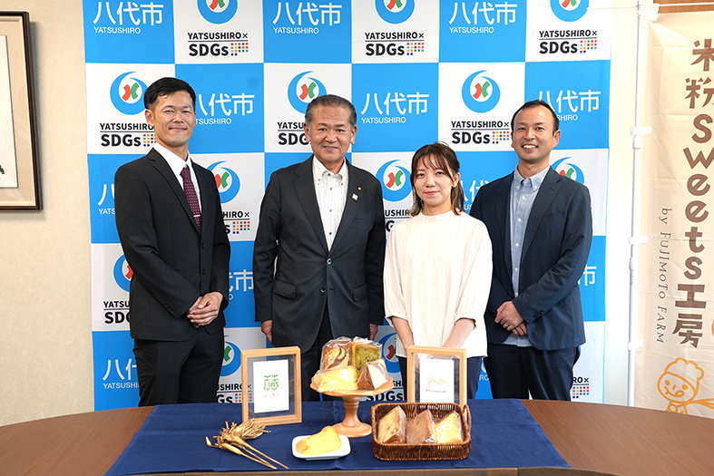 7月16日(火)、八代産米を使用した「米粉シフォンケーキ」の完成報告の為、八代市北新地のFUJIMOTO農園から代表の藤本和裕氏夫妻と、新商品開発・販路拡大に係るマッチング事業者である「株式会社Move On」代表の水永貴夫氏が八代市役所を訪れ、中村八代市長に表敬訪問を行ないました。このシフォンケーキは同農園で生産された八代産ヒノヒカリが使用されておりグルテンフリーかつ無添加であり、プレーン、チョコなど6種類のラインナップとなっています。今年7月11日(木)より販売開始されており、「米粉Sweets工房」で購入出来ます。また今後は八代のスイーツの定番を目指し、お米以外の八代の特産品とコラボした新たなラインナップやふるさと納税返礼品としての登録も計画中です。なお、現在商品の方は2日前までの完全予約販売となっておりますので、ご購入希望の方は必ずご予約をお願い致します。