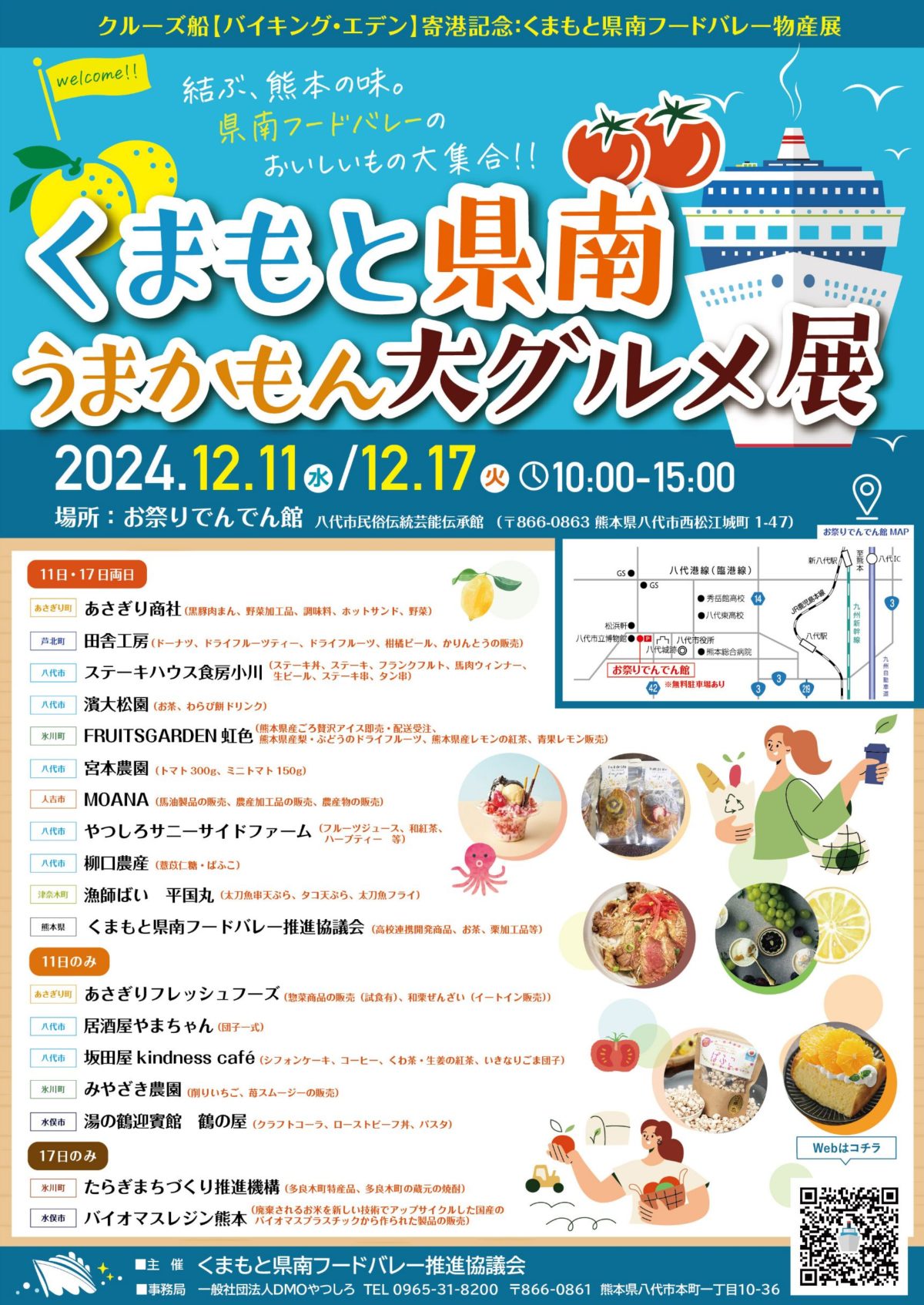 12月11日(水)、17日(火)のクルーズ船 バイキング・エデン号寄港にあわせて、くまもと県南フードバレー物産展をお祭りでんでん館(八代市民俗伝統芸能伝承館)にて開催されます。