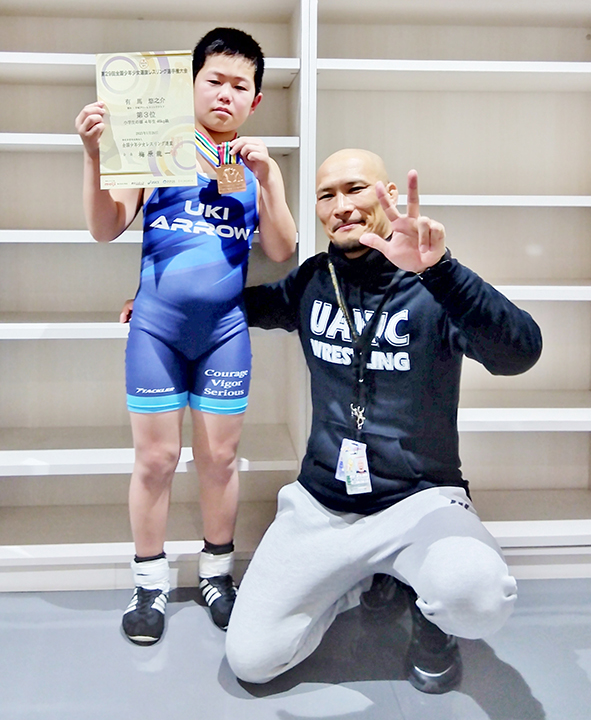 東京都板橋区で開催された全国少年少女選抜レスリング選手権大会。夏の全国大会でベスト8以上の選手しか出場できないこの大会で、夏の全国大会に続き、見事第3位に入賞を果たしたのは、宇城アローレスリングクラブに所属する有馬悠之介くん(八代市立太田郷小学校4年)です。有馬くんは、夏の全国大会後も今大会での上位入賞を目指し、人一倍レスリングの練習に励んで来ました。「とにかく悔しい。日本一を目指してこれからも頑張りたい。レスリング生活を支えてくれている家族や指導して下さる先生方に感謝しています!」と、悔し涙を流しながらも今後の目標に向けて抱負を語ってくれました。