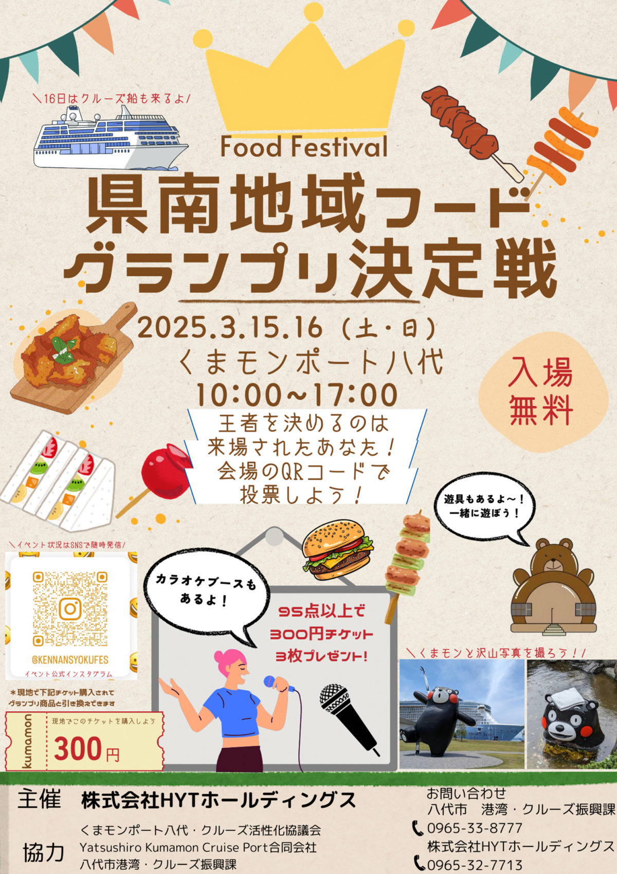 3月15日(土)、16日(日)の2日間(10:00~17:00)に渡り、県南地域の「食」のNo.1を決めるコンテスト「県南地域フードグランプリ決定戦」が、くまモンポート八代で開催されます。来場時に会場に設置されたQRコードからの皆様の2日間の合計投票数により、出店者のNo.1が決定します。また、イベント2日目となる16日(日)には、クルーズ船「アドラ・マジックシティ」が寄港予定です。入場は無料となっておりますので、この機会にぜひ、くまモンポート八代に足を運んでみてはいかがでしょうか?