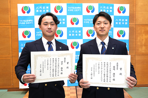 3月3日(月)、八代広域行政事務組合消防本部体力錬成室において、第46回八代広域消防本部消防職員意見発表会が行われました。この発表会は、火災・救急対応や防火・防災指導について消防職員が日頃の業務で感じていることや業務における新しい取り組みへの意見・提言を発表する場として、毎年開催されています。今回の発表では「AI(あい)ある未来」と題し、消防訓練や災害時の対応にAIを活用する発表を行った氷川分署の宮﨑健斉消防士が優秀賞に、「夜を知り明るい未来へ」と題し、介護施設などでの夜間の避難訓練の必要性を説いた、鏡消防署の須﨑澄空消防士が最優秀賞に選ばれました。なお、今回最優秀賞となった須﨑消防士は、八代の消防士代表として4月11日(金)に人吉市で行われる「第48回熊本県消防職員意見発表会」に出場します。