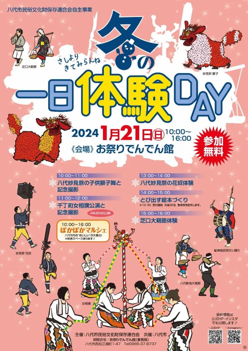 妙見祭の子ども獅子と千丁町女相撲の公演、八代妙見祭の花奴、芝口大鞘節の体験他、とび出す絵本づくりと、八代の民俗芸能を体験できます。