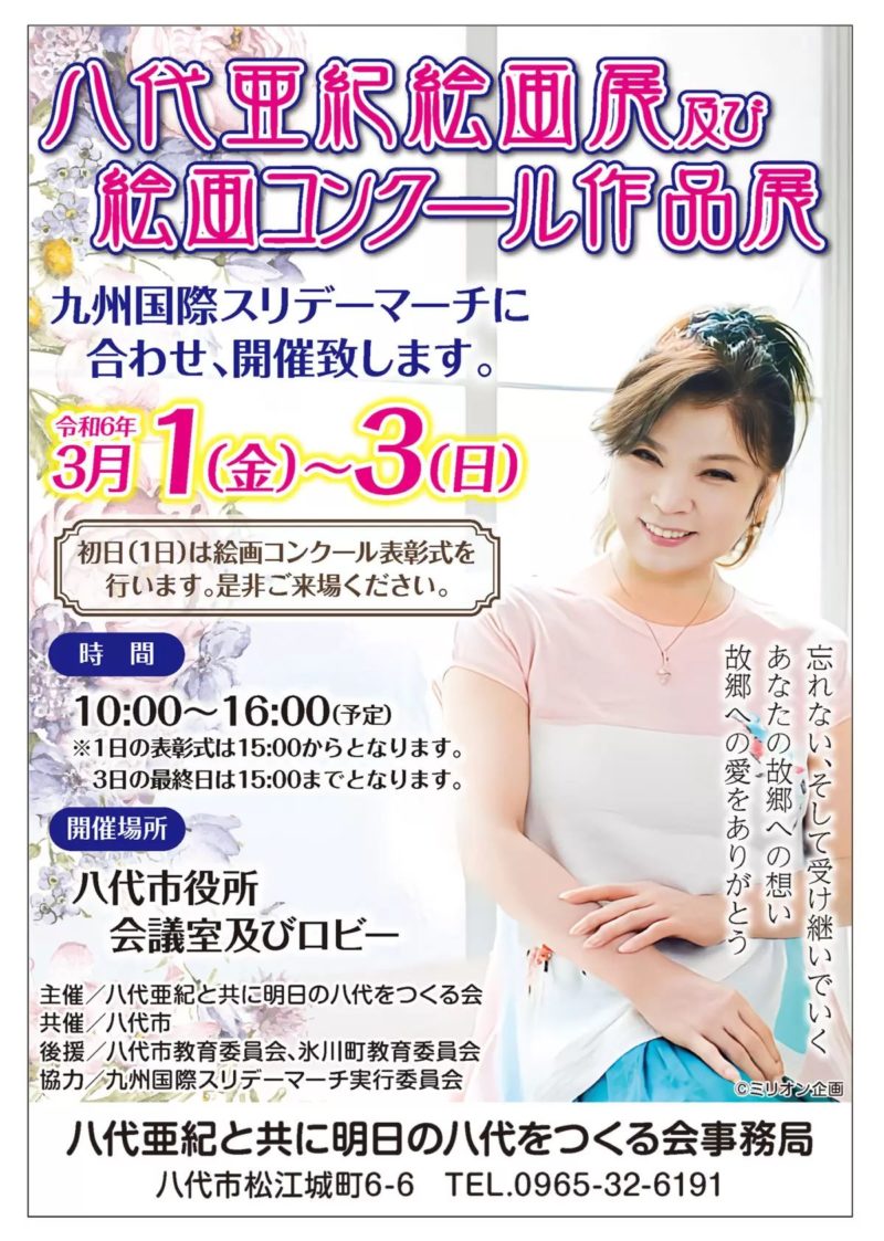 場所:八代市役所 会議室及びロビー/八代市松江城町1-25 時間:10:00~16:00 故八代亜紀さんの作品が多数展示される八代亜紀絵画展を、3月の1日~3日の3日間、九州国際スリーデーマーチに合わせ開催します。