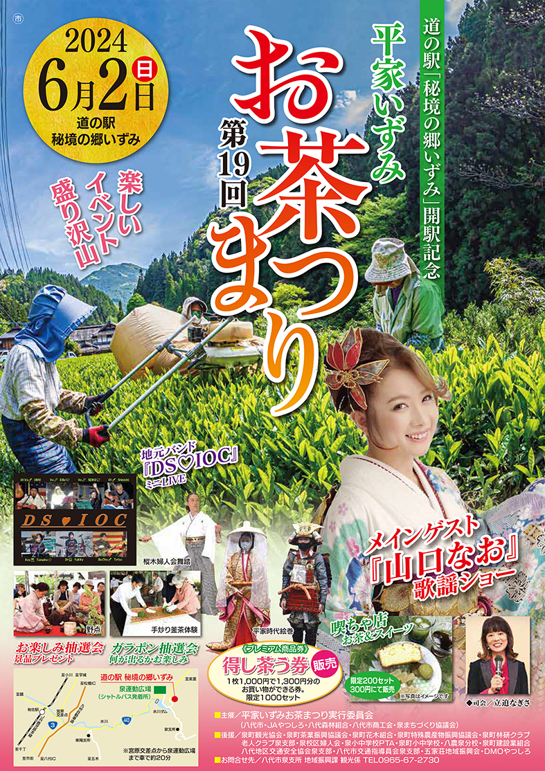 道の駅「秘境の郷いずみ」を会場に、新茶などの特産品販売や八代市出身の歌手「山口なお」さんの歌謡ショー、