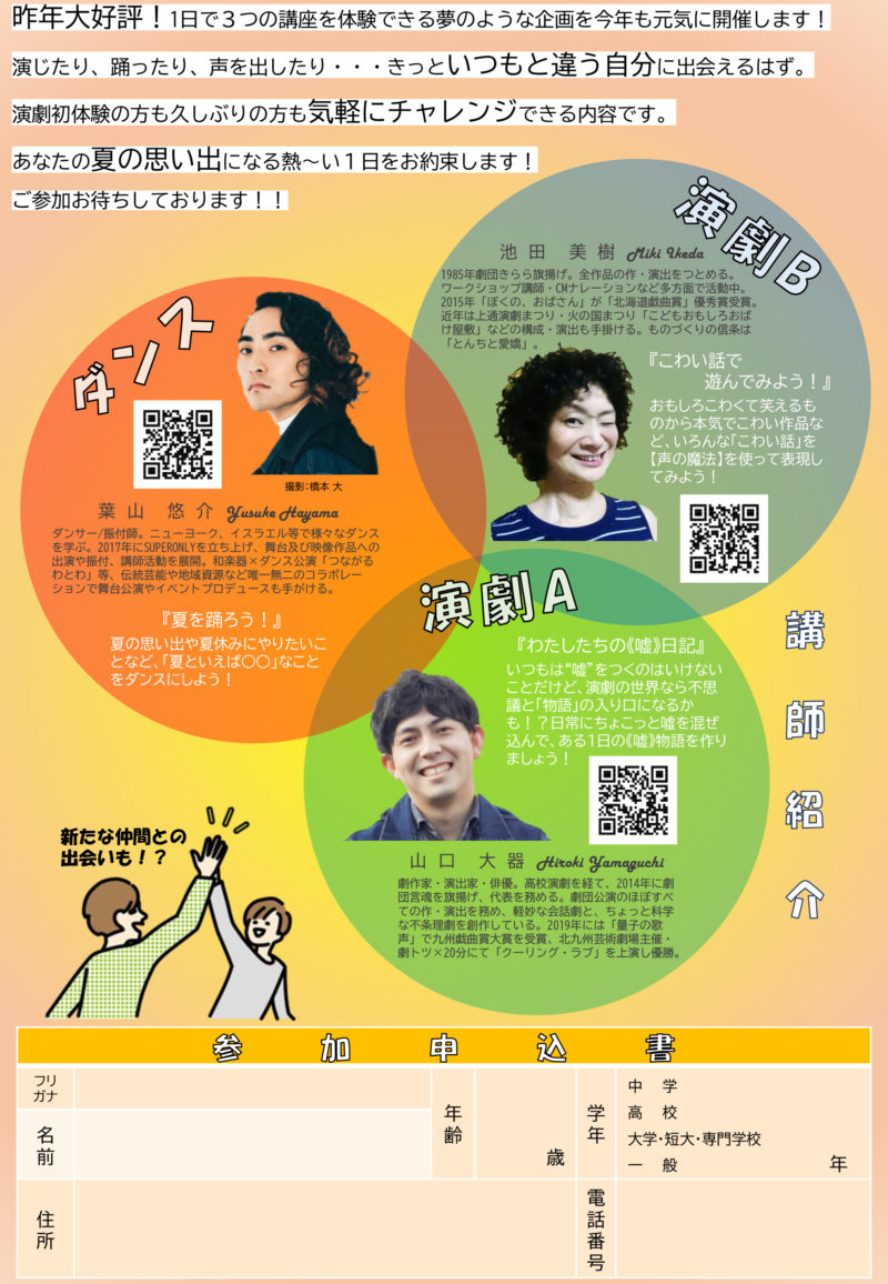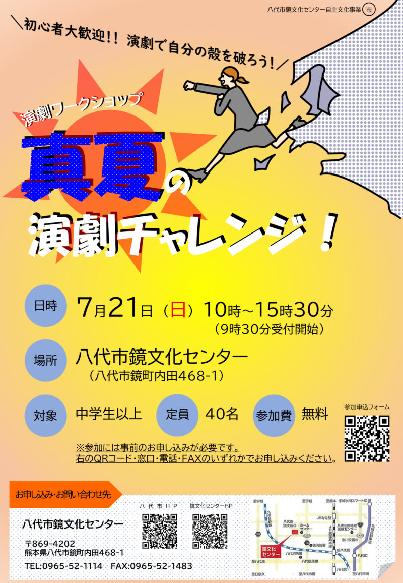 場 所:八代市鏡文化センター(リハーサル室)/ 八代市鏡町内田468-1 時 間:10:00~15:30 参加費:無料 対 象:中学生以上 定 員:40名 ◇事前申込制(QRの参加申し込みフォーム、または下記まで) お問合せ:八代市鏡文化センター/0965-52-1114