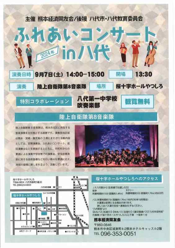 陸上自衛隊第8音楽隊によるコンサートが開催されます。八代第一中学校吹奏楽部との特別コラボレーション演奏もあり、