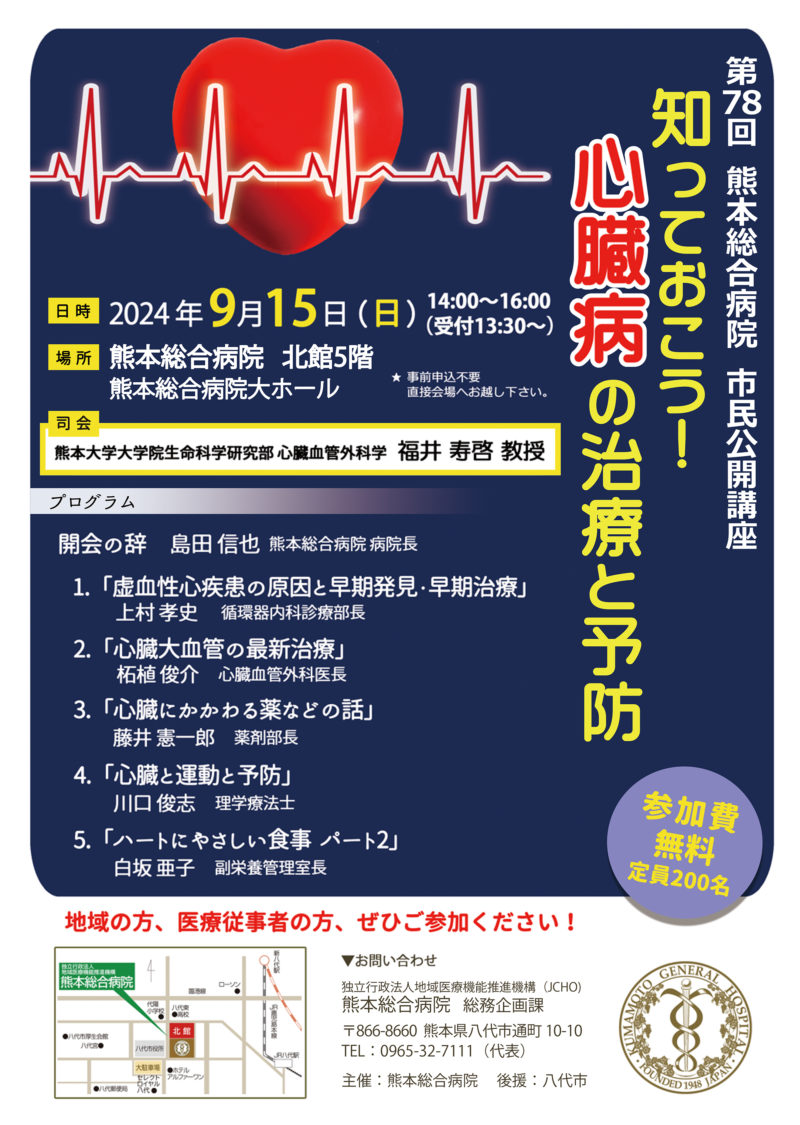 熊本大学心臓血管外科の福井 寿啓教授を司会にお招きし、地域の方や医療従事者を対象に、熊本総合病院の医師、薬剤師、理学療法士、管理栄養士が