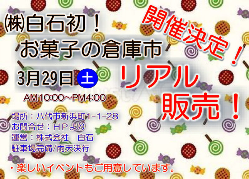 株式会社白石の初開催となる「お菓子の倉庫市」。楽しいイベントも開催予定!ぜひお誘い合わせの上ご来場ください。(駐車場完備/雨天決行)