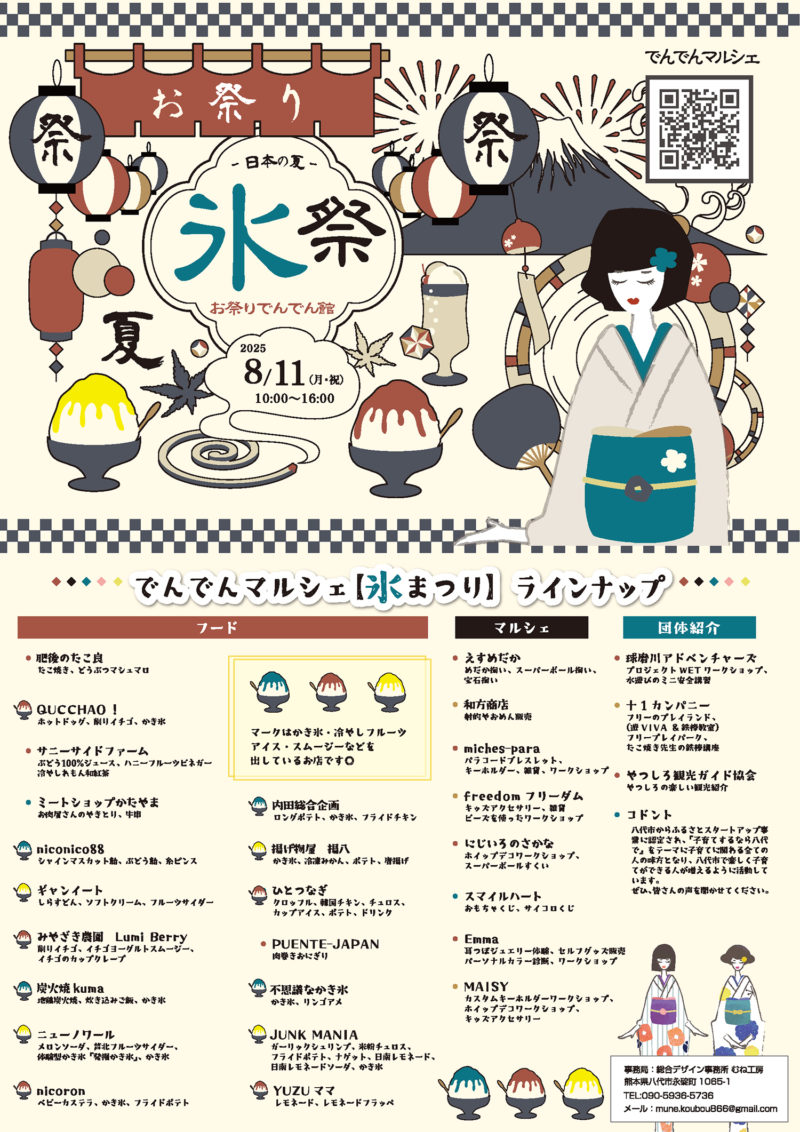 お祭りでんでん館夏の一日体験DAYと同時開催し、昨年大好評だった「かき氷まつり」が、今年もパワーアップ! “かき氷の食べくらべ”を楽しみませんか?今年も多彩なキッチンカー、マルシェ、ワークショップが大集合! お問合せ:お祭りでんでん館 ☎0965-37-8737