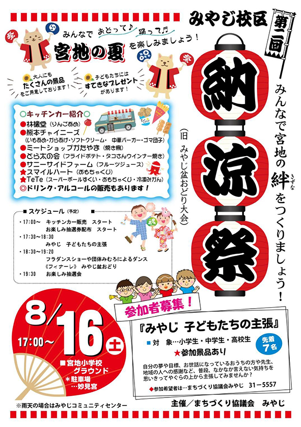 昨年大好評だった納涼祭が今年も開催!「みやじ 子どもたちの主張」や、ダンスショー、フィナーレに「みやじ盆おどり」が開催されます。
