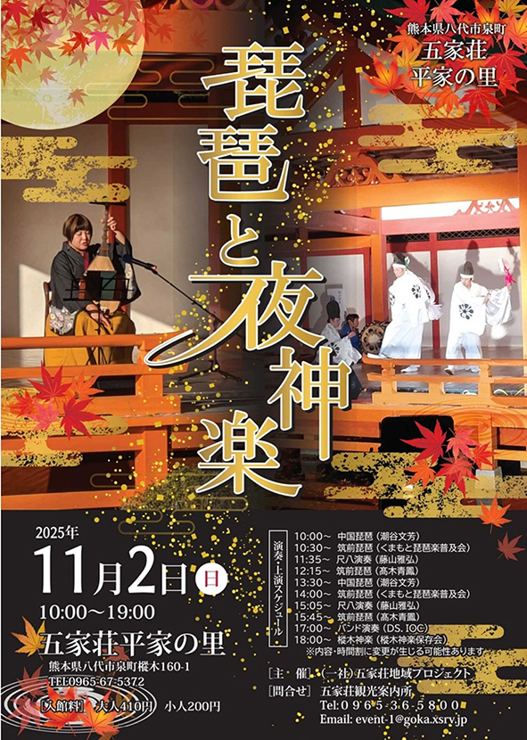 紅葉が美しい五家荘「平家の里」で、中国琵琶や筑前琵琶、尺八の演奏、樅木神楽が楽しめます。