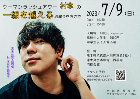 「ウーマンラッシュアワー村本」独演会が氷川町西福寺で開催されます。 渡米前の緊急開催!!当日は、熊本市にあるワ…