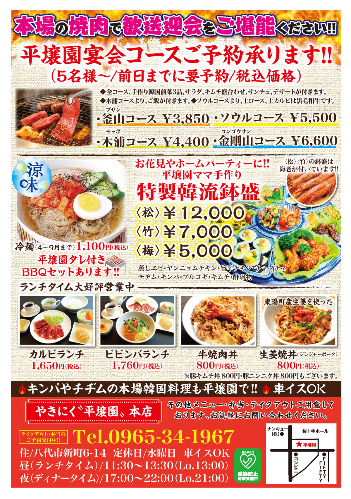 内容は、チャプチェ、チヂム、ヤンニョンチキン、甘辛チキン、キンパ、キムチ、酢の物、焼肉