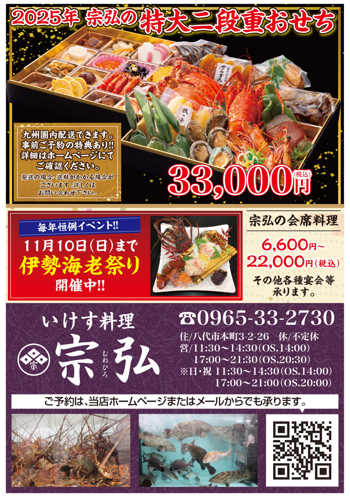 当店宗弘は、社長が漁師であるからこそ新鮮な海の幸を提供でき、又、八代・天草の魚市場に加入している為(鮮魚仲買)、旬の地魚や天然活魚をそのまま産地直送にてお客様のもとに新鮮な魚介類を提供できる店です。